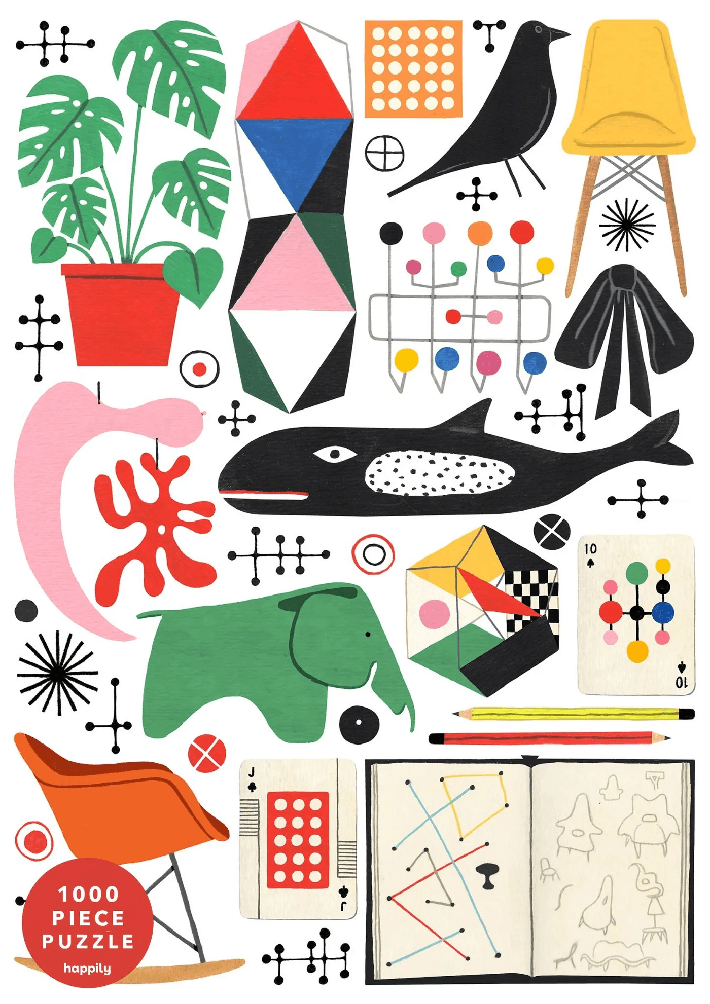 1,000 piece puzzle featuring fun illustration of Classic Eames designs by Holly Maguire.
