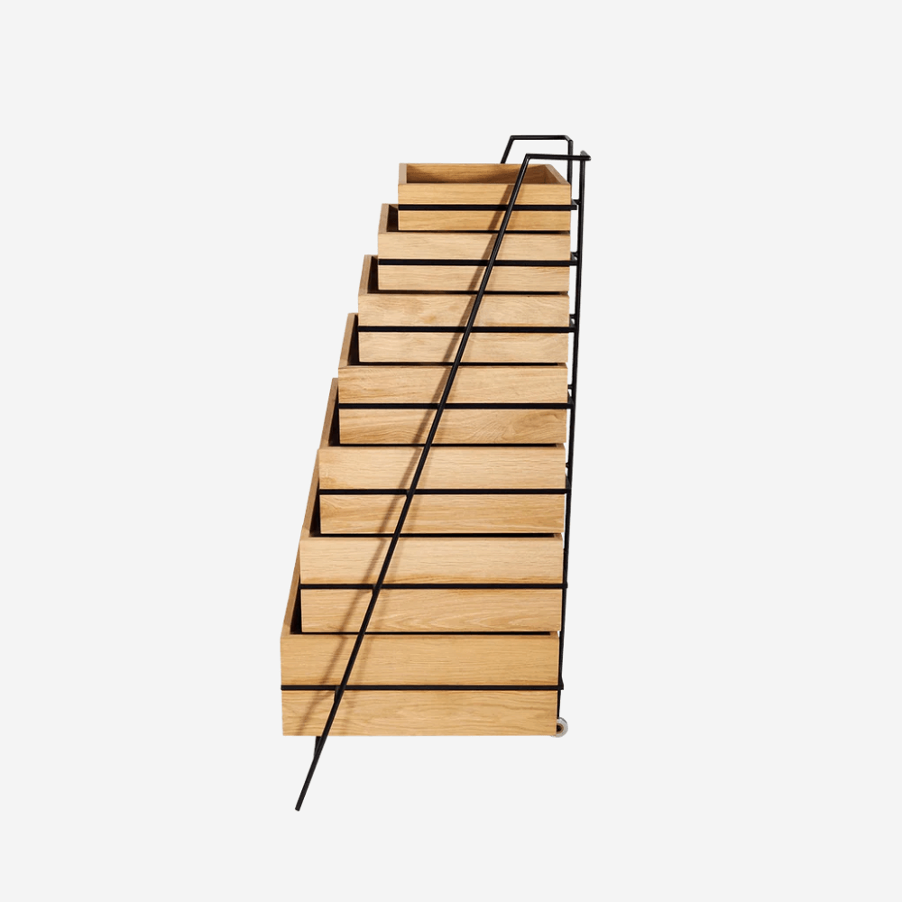 Defined by a minimal, easy-to-move steel frame with handles and wheels, and seven stackable solid oak drawers, Sutoa is a sculptural storage solution designed in Tokyo for organizing objects. This statement piece takes its name from the Japanese word Sutoa—’to contain.’