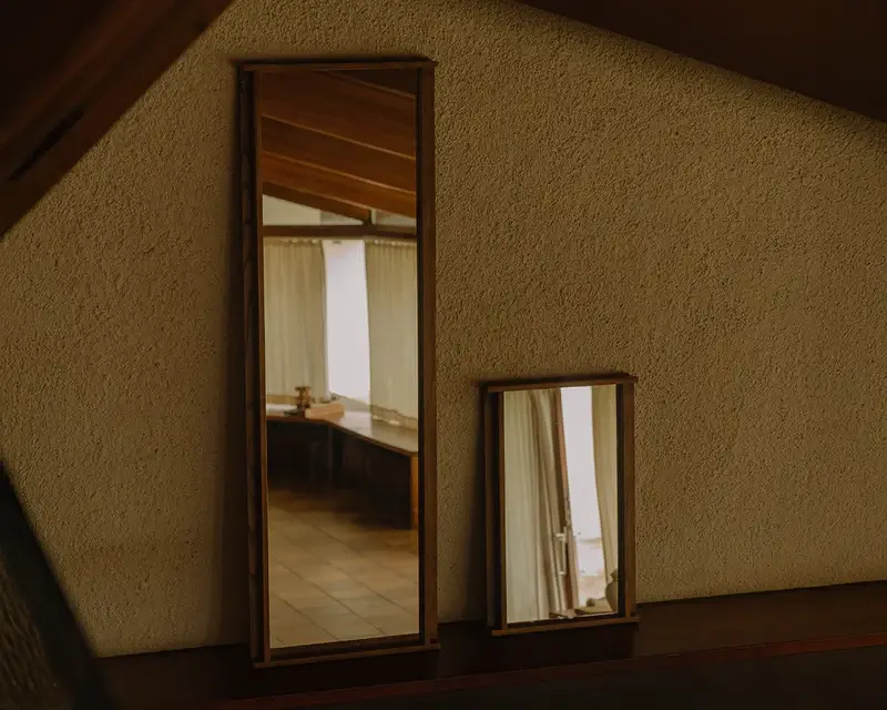 The first extension of the Symmetry Series beyond seating, Symmetry Mirrors are now offered in both large and small scales—a significant expansion of the FRAMA mirror universe. As the Symmetry Series seating makes use of repeated wood planks to create mirror images in perfect symmetry, Symmetry Mirrors now use this design strategy in mirrored material itself. Material interplay with a slim profile and minimal design intervention.