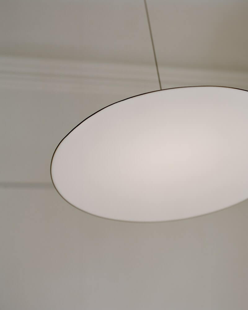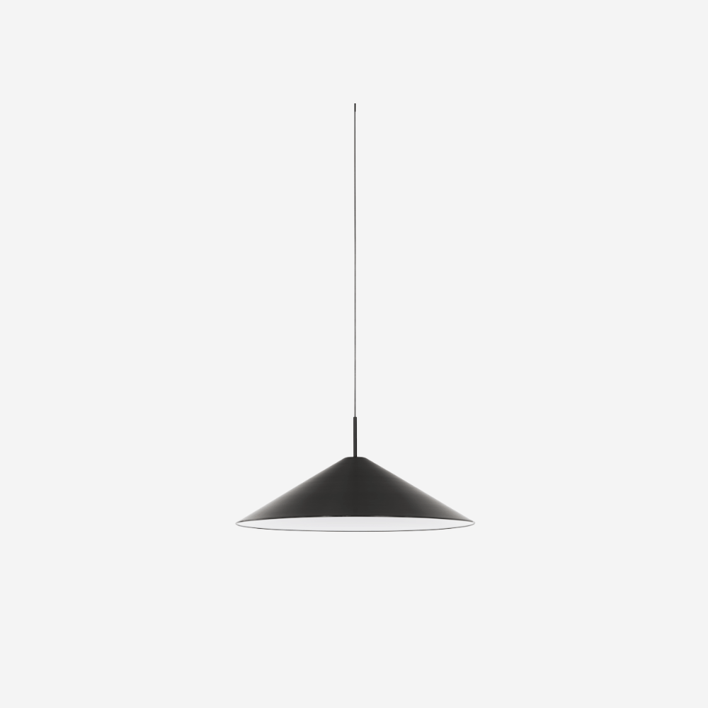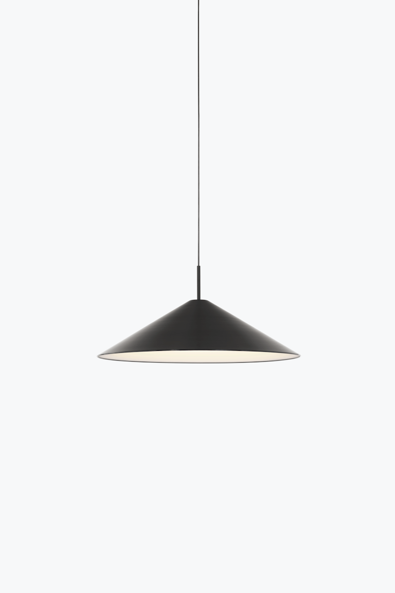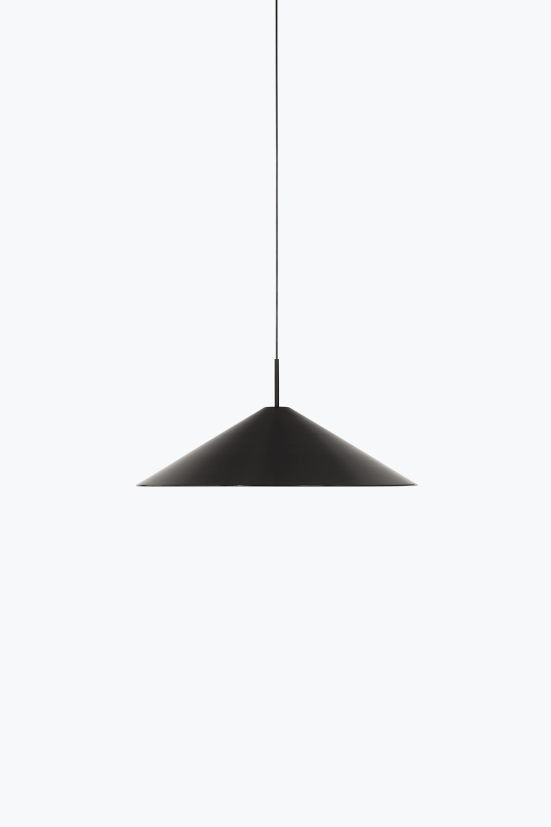 The Brolly lighting series demonstrates the strength of simplistic shapes. Precise and considered, these elegant lights display the kind of thoughtful, almost deceptive, simplicity that makes them timeless particularsin any decor. In this pendant version of the Brolly Lamp, the conical lampshade is magnified into diameters of 70 and 90 centimetres, their sharp volumes enhancing the architectural expression of the design. The concave diffuser spreads a soft and generous light that does not blind you when you are seated beneath the lamp. Let the pendant hover above the dining table or wherever pleasant light and a significant silhouette are sought.