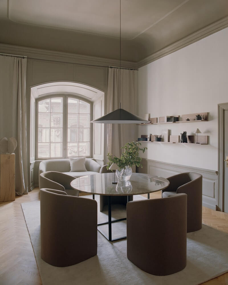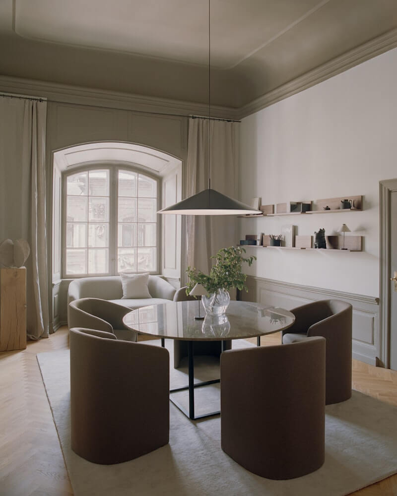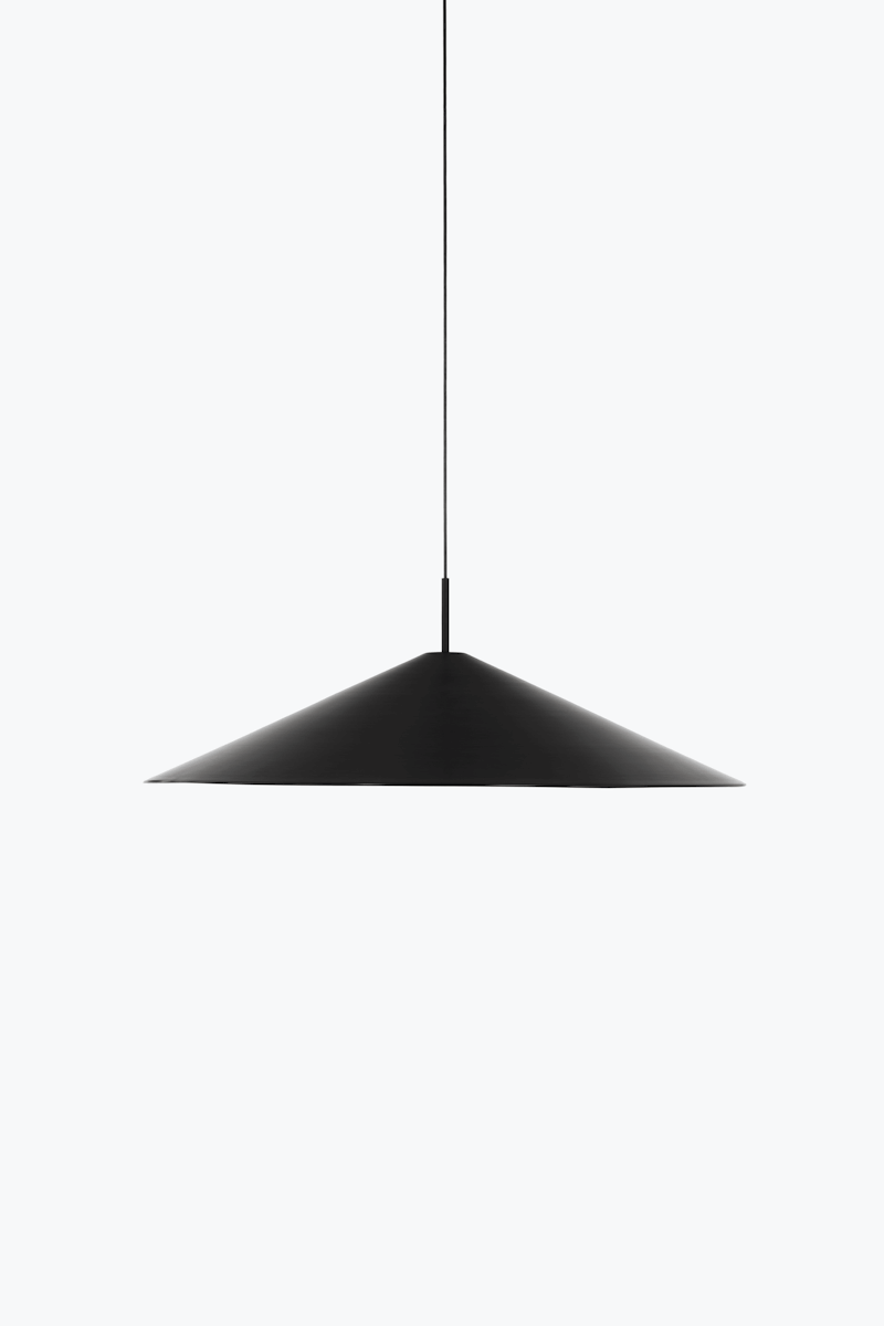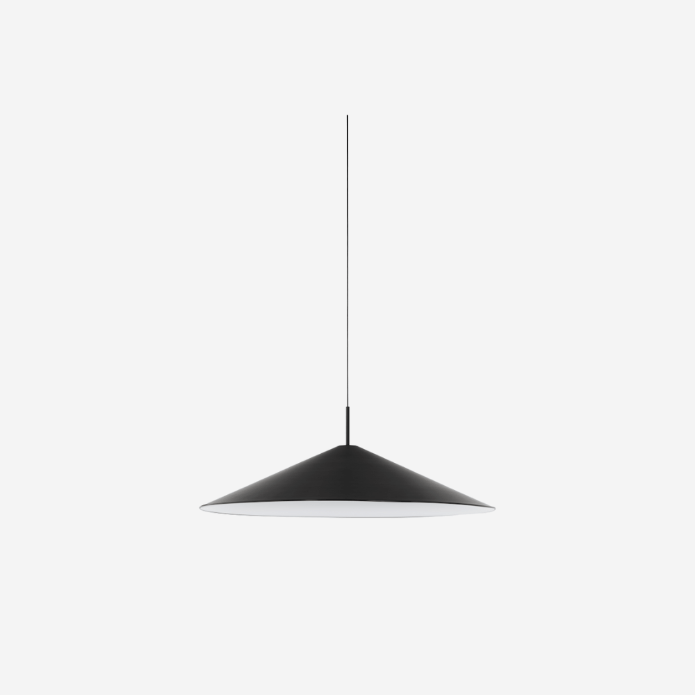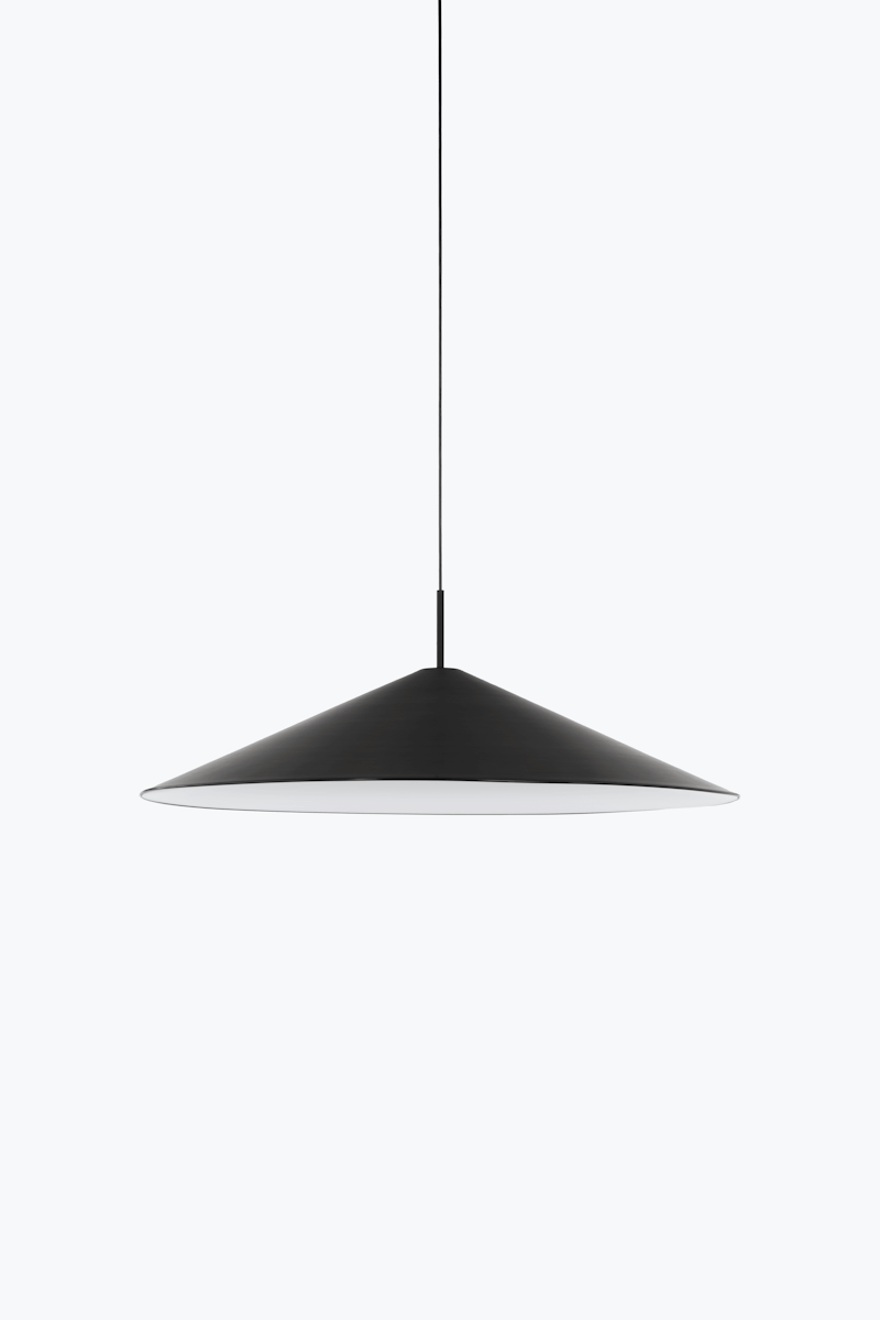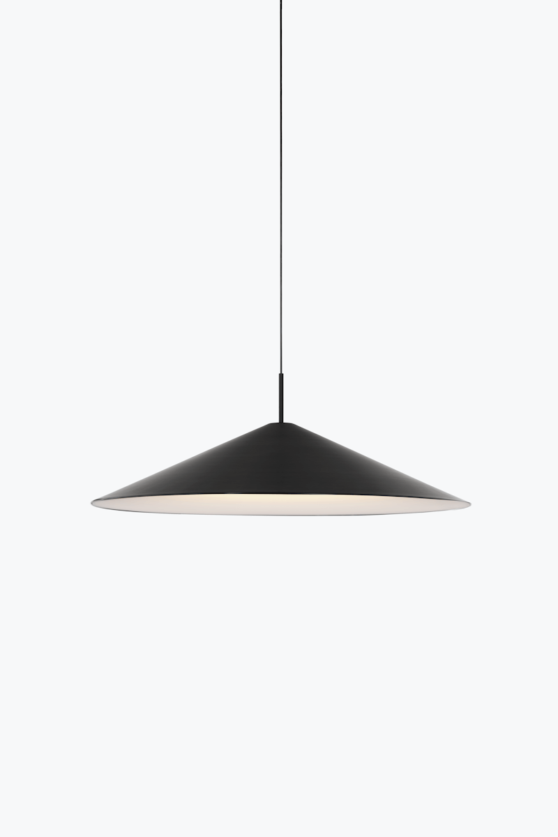 The Brolly lighting series demonstrates the strength of simplistic shapes. Precise and considered, these elegant lights display the kind of thoughtful, almost deceptive, simplicity that makes them timeless particularsin any decor. In this pendant version of the Brolly Lamp, the conical lampshade is magnified into diameters of 70 and 90 centimetres, their sharp volumes enhancing the architectural expression of the design. The concave diffuser spreads a soft and generous light that does not blind you when you are seated beneath the lamp. Let the pendant hover above the dining table or wherever pleasant light and a significant silhouette are sought.